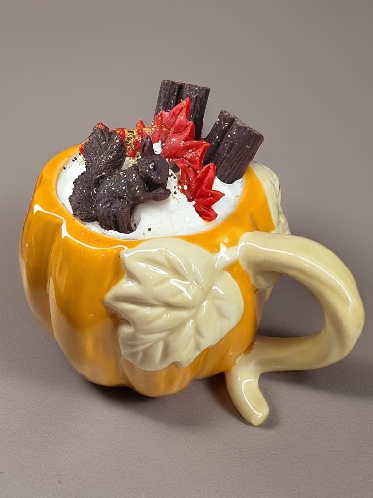 Das handgegossene Wachs ist liebevoll dekoriert mit einem kleinen Eichhörnchen, roten Blättern und Zimtstangen Details, die wie frisch aus dem Wald wirken.