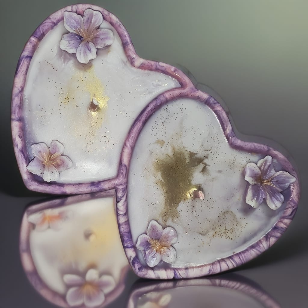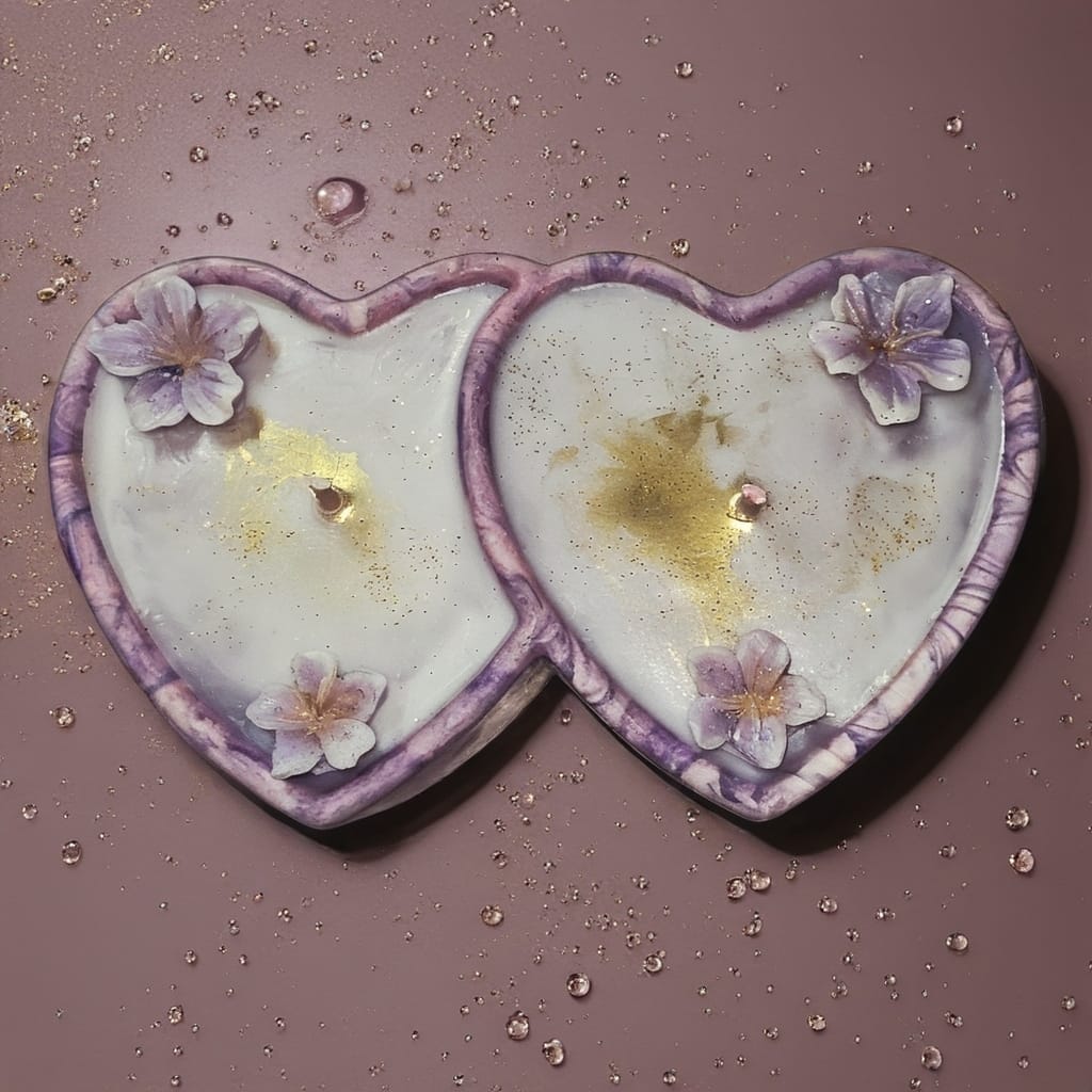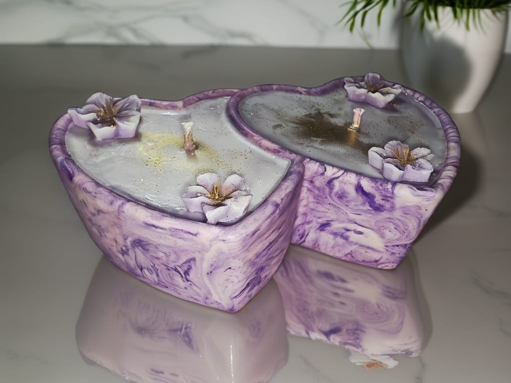 Verliebe dich in dieser traumhaften Doppelherz-Kerze im eleganten lila Marmor-Effekt. Handgefertigt mit viel Liebe zum Detail, verziert mit zarten Blüten und edlem Goldeffekten – ein absoluter Blickfang für dein Zuhause oder als romantisches Geschenk.