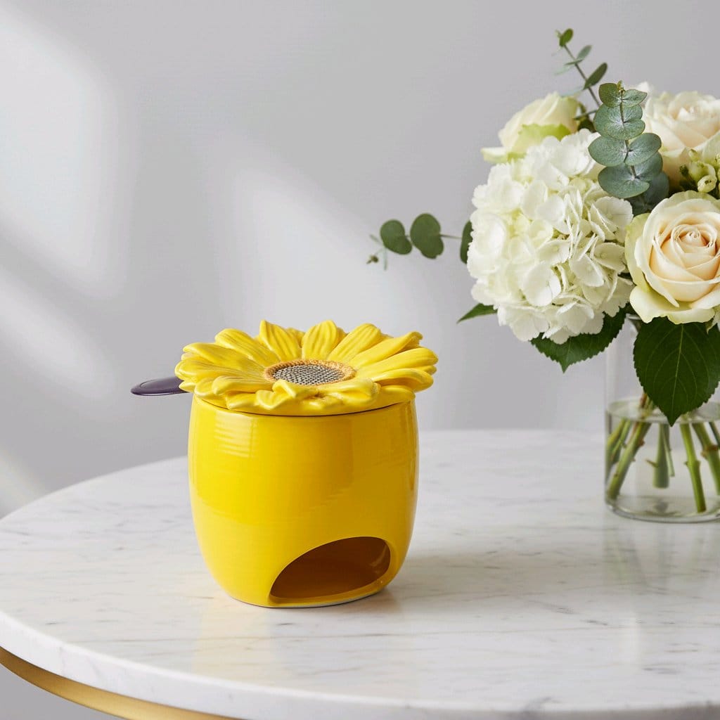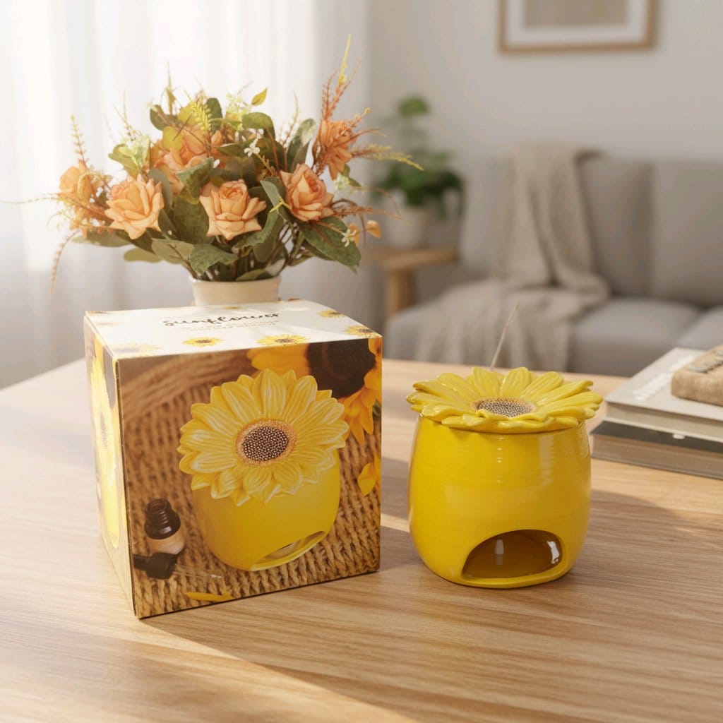 Diese wunderschöne Keramik Duftlampe in leuchtendem Gelb bringt sofort gute Laune in dein Zuhause. Das liebevoll gestaltete Sonnenblumen Design wirkt frisch, freundlich und gleichzeitig gemütlich perfekt, um jeden Raum mit Wärme und Harmonie zu erfüllen.