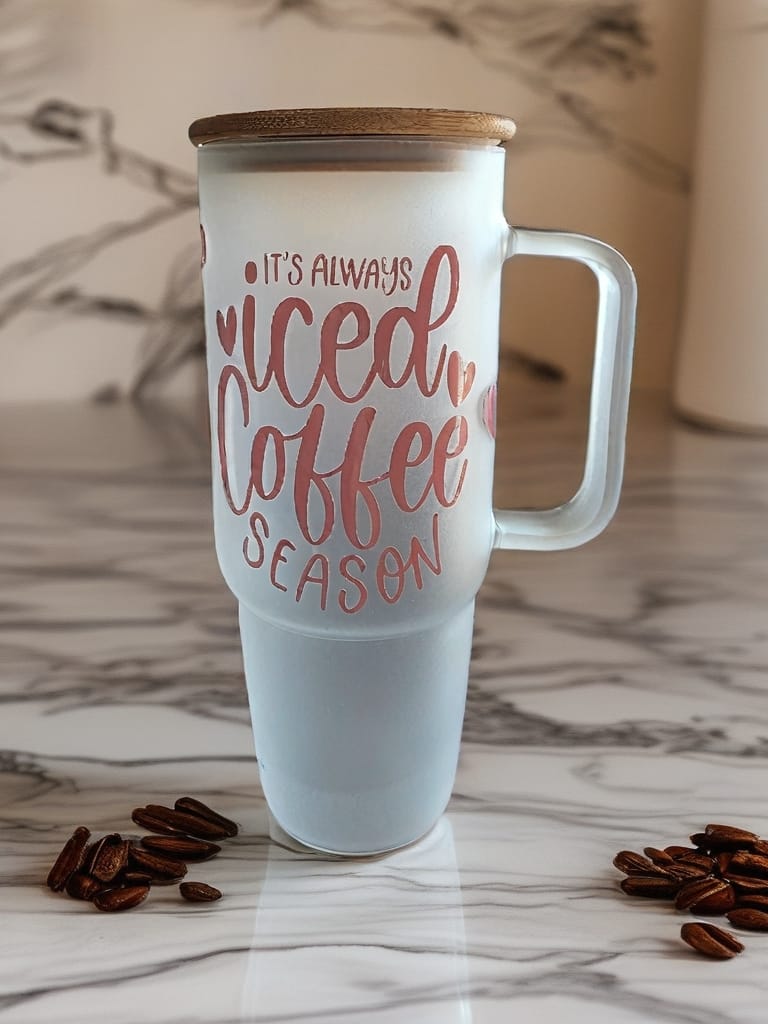 Das matte Glas, kombiniert mit dem verspielten „It’s Always Iced Coffee Season“-Design und süßen Herzmotiven, macht ihn zu einem echten Hingucker – perfekt für dein Home-Office, den Coffee-to-go oder als Geschenk für Kaffee-Fans.