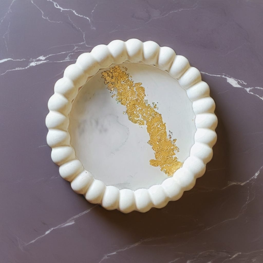 Diese edle handgefertigter Untersetzer vereint zeitloses Design mit einem luxuriösen Hauch von Glamour. Der sanft gewellte Rand verleiht ihr eine verspielte, organische Form, während der vergoldete Akzent im Inneren für ein stilvolles Highlight sorgt.
